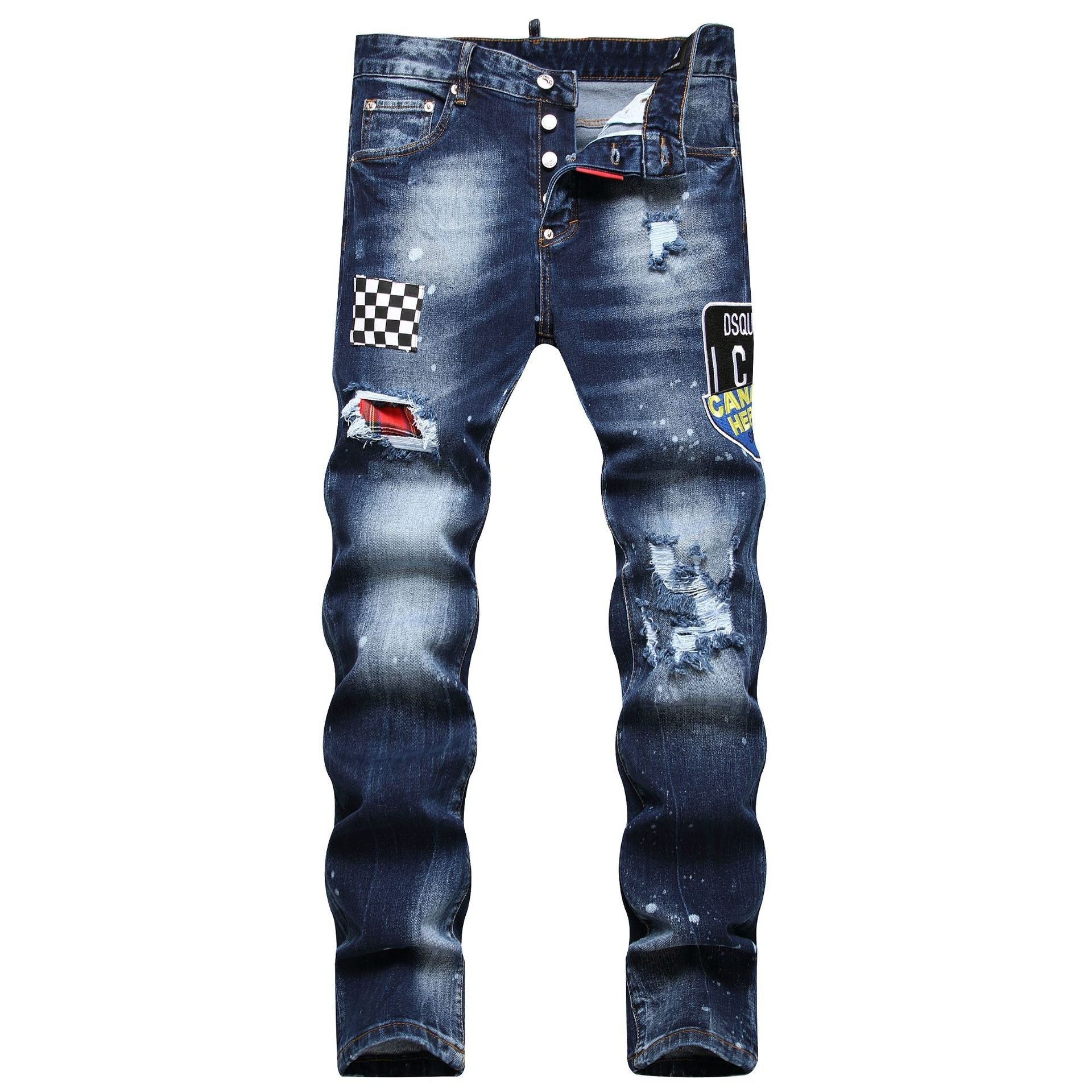 Five-pocket jeans are versatile trousers that are now part of global everyday life. The slim-fit style is ideal for creating many different outfits. This black version with all-over spots is recommended for looks with a rock flavour and is easy to combine with garments with distressed or vintage-looking details.